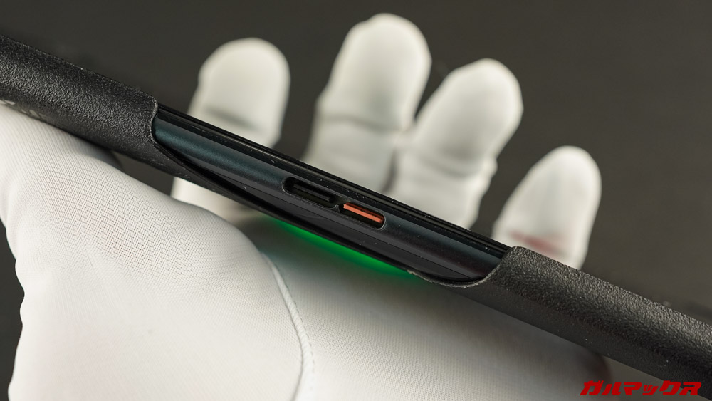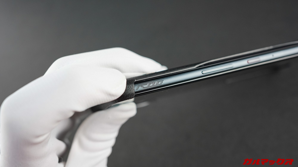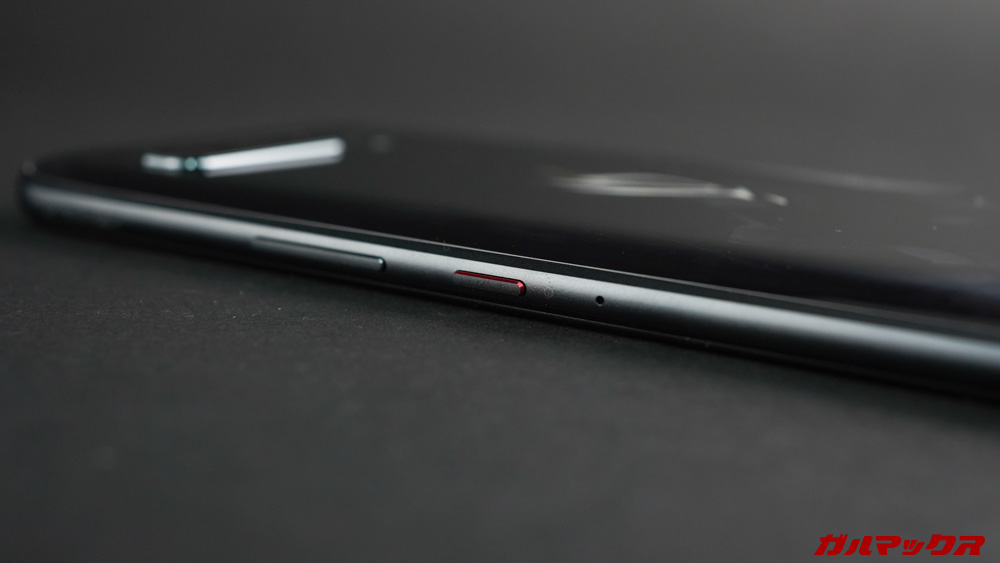 ▼ROG Phone 3の注目ポイントの1つであるLRボタン!XiaomiのBlack Sharkと異なりタッチ式となっております。ロゴが入っている部分がセンサーになっているんです。↓
