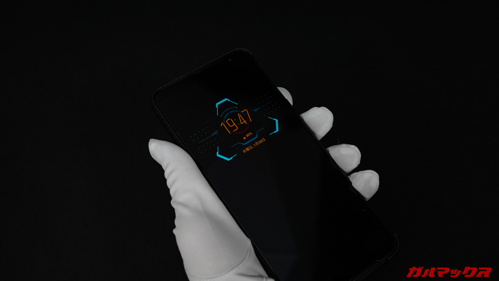 ▼画面オフ時でも時刻を常時表示してくれる、有機ELディスプレイの特権のAoD機能を搭載。デザインもゲーミングチックでSFチックでカッコいい!↓