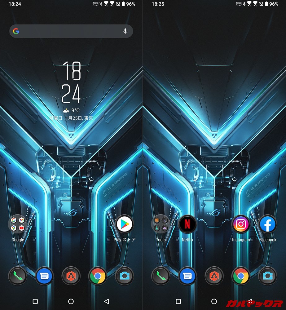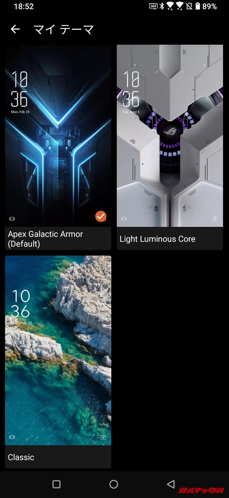 ▼初期ではテーマが3つあり、1つ目と2つ目はROGスタイルなんですが、もう1つは純正Androidのスタイルが用意されているんです。↓