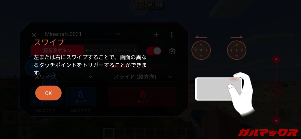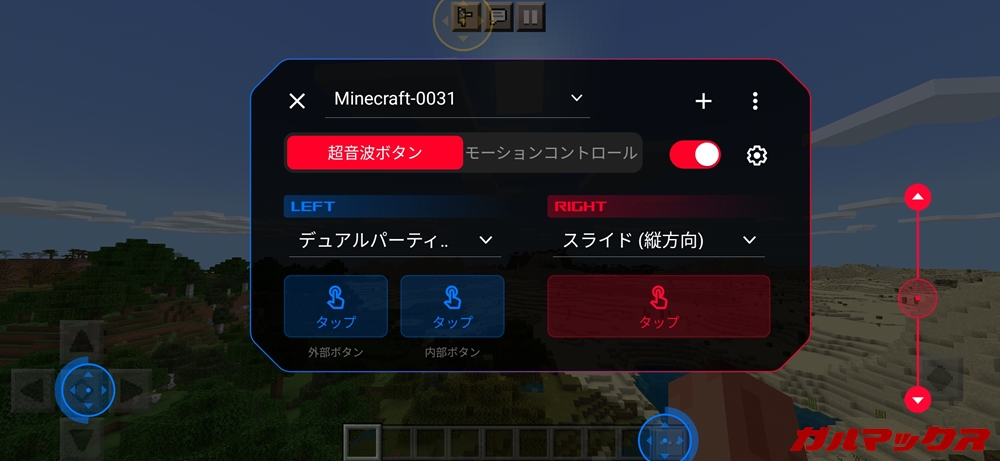 ▼スライドはLR部分のスライドに応じて、画面をスライドするという仕組みになっています。視点変更だったり照準調整だったり応用が効きそう!もちろん感度の調節も可能です。↓