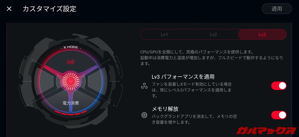 ▼このXモードは更に段階別の設定が出来るんす。レベルは1から3まであり、最大の3レベルに設定すれば発熱と電力消費を度外視した完全体モードになります!ただしレベル3のみ冷却クーラー必須。ファンを装着した際にXモードにすると自動でレベル3まで適用する設定もあります。↓