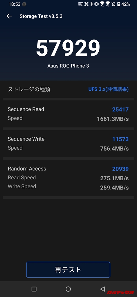 ▼ストレージ速度は読み込みが1,661MB/s、書き込みが756MB/s。メチャクチャ速い!アプリもゲームの読み込みもマジで差が感じられるレベル。↓