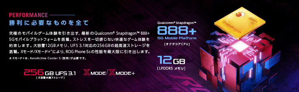▼ROG Phone 5sはSnapdragon 888+を搭載。ベースではSnapdragon 888でしたが更に性能がアップしています!またROG Phoneスマホ特有のXモードに加えてXモード+なるゲーム特化機能も対応しており、重いゲームもサクサク遊べそう!↓