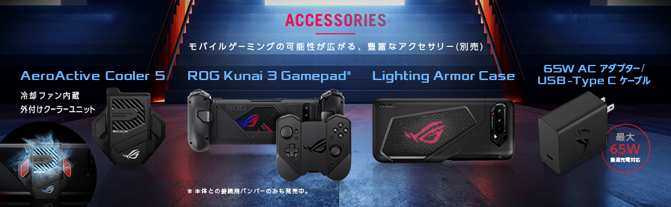 ▼ゲーミングアクセサリーも充実!外付けの物理冷却ファンやコントローラー、急速充電器も使えます。筐体自体はベースのROG Phone 5と同じなのでそのまま使い回すことも出来ます。↓