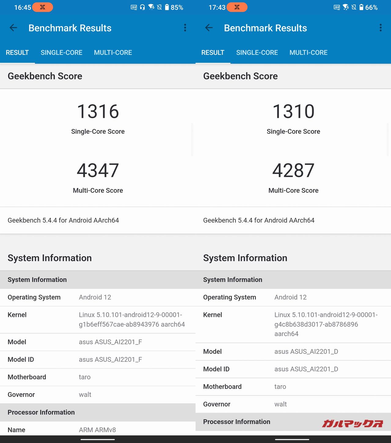 ▼Geekbench 5のスコアは以下の通り。左がROG Phone 6、右がROG Phone 6 Proです。↓