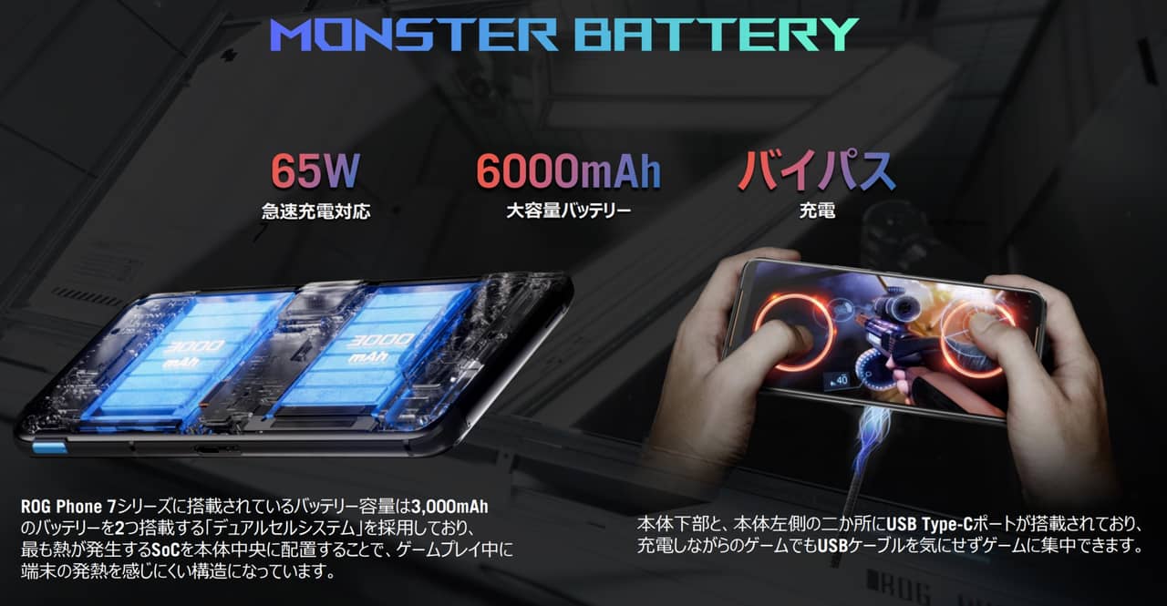 ▼ROG Phone 7 / 7 Ultimateも65Wの超急速に充電しているけれど、それよりも「バイパス充電」に対応しているのがゲーマーとしては嬉しい!↓