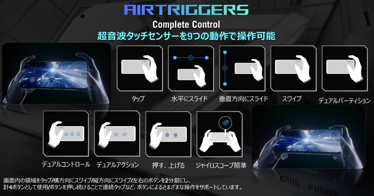 ▼ゲーミングスマートフォンのハードで代表的なギミックといえばLRボタン。ROG Phone 7 / 7 Ultimateではセンサー式を採用することで物理ボタンでは実現できない多彩な入力に対応!↓