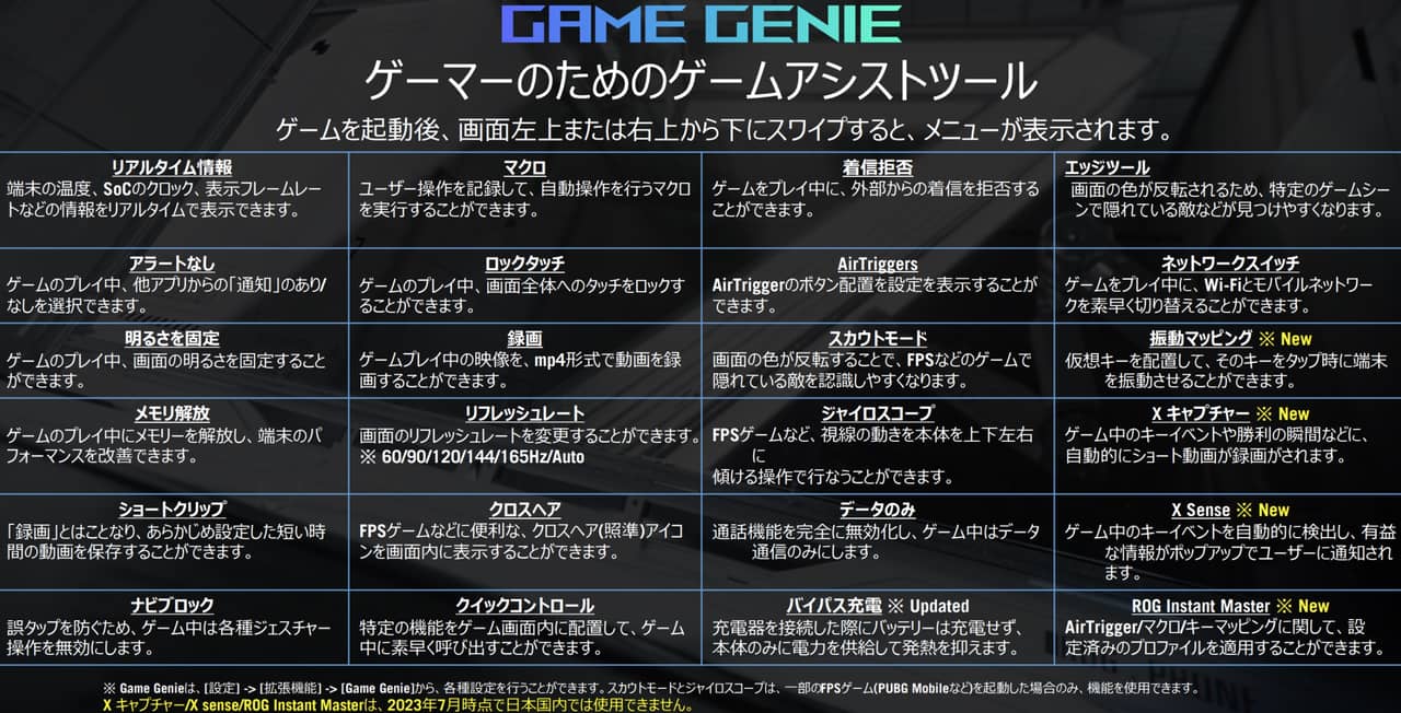 ゲーミングスマートフォンといえば、ゲームを有利にプレイできるゲーミング機能やギミックが搭載されているのが特徴。ROG Phone 7 / 7 Ultimateはこれでもかとゲーミング機能が詰め込まれてる!