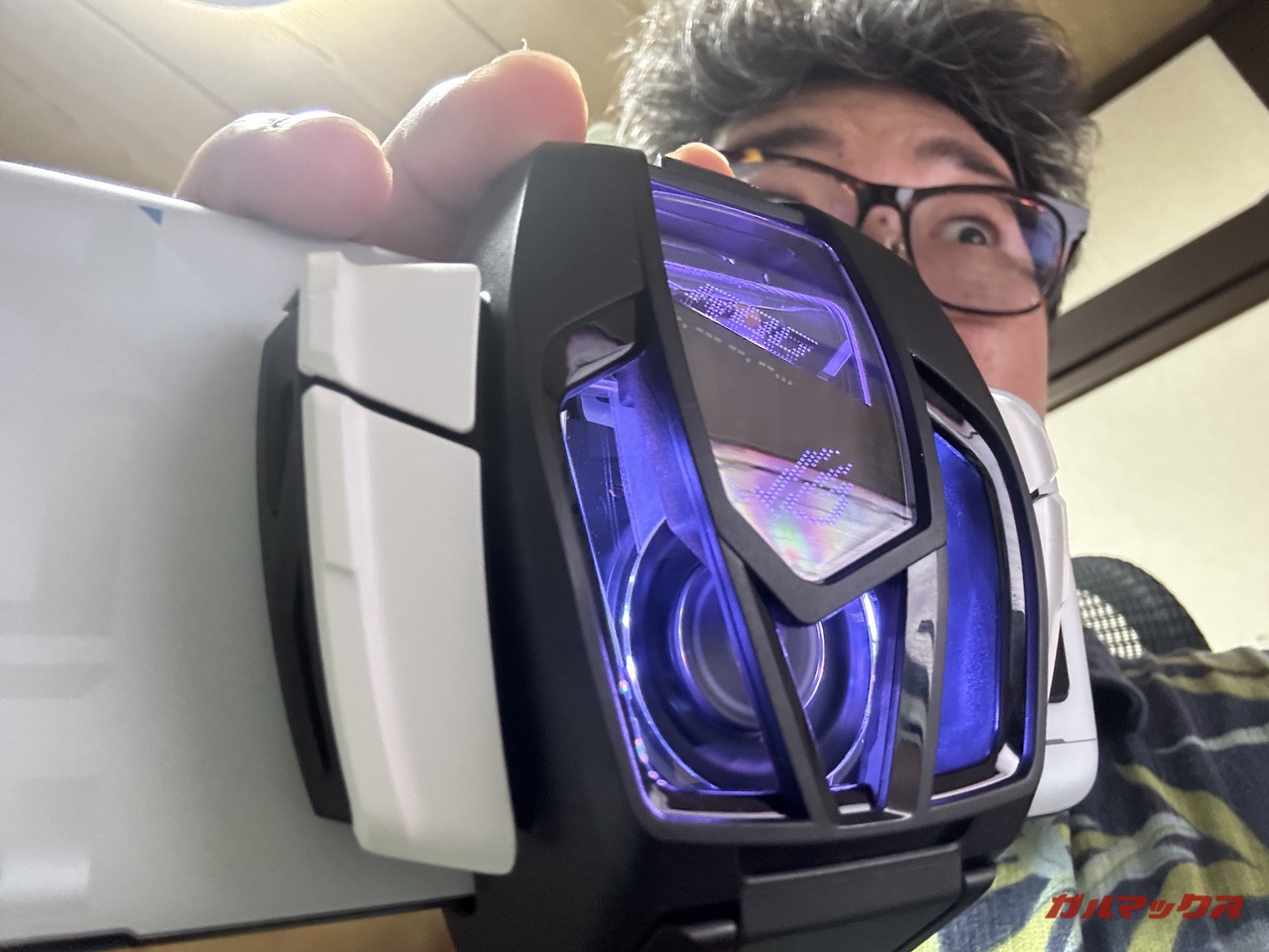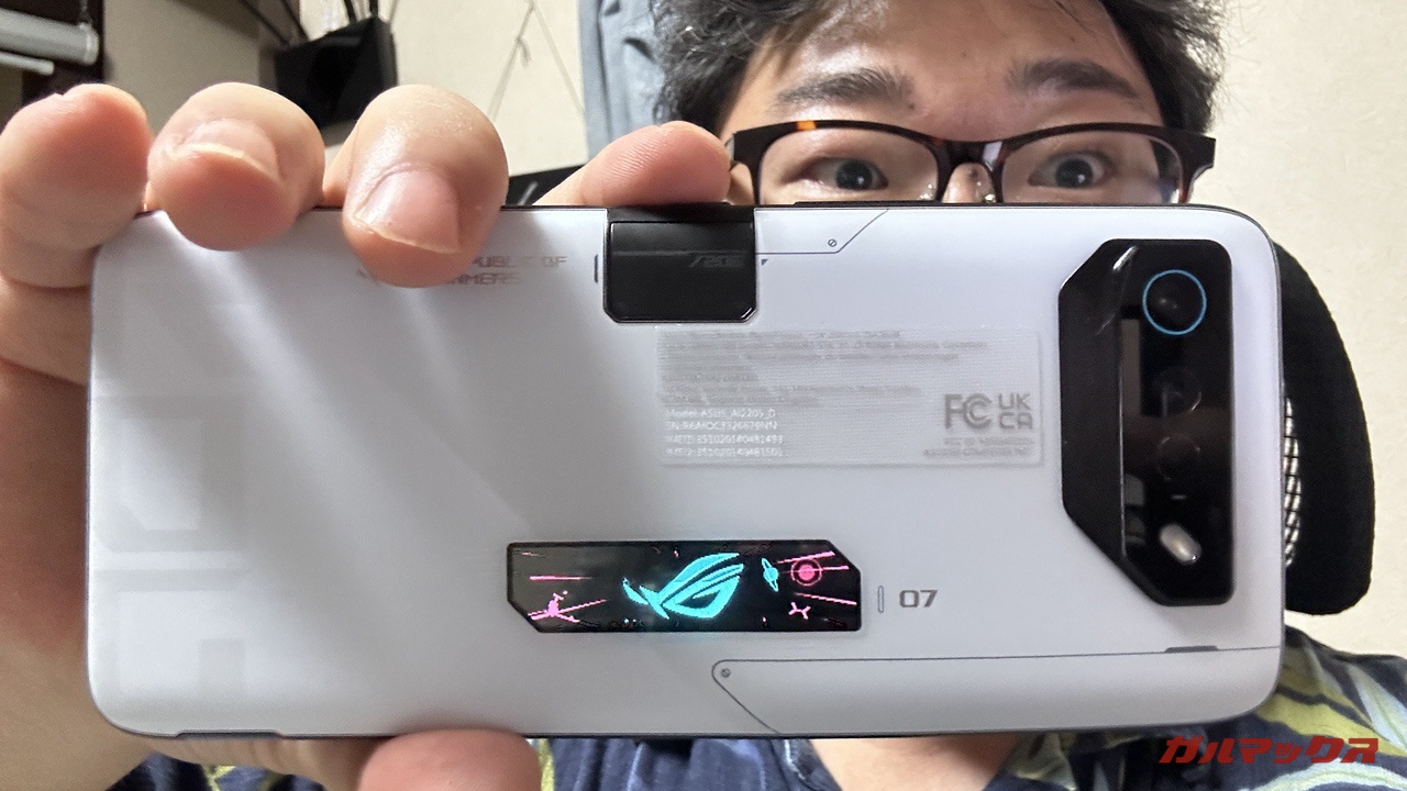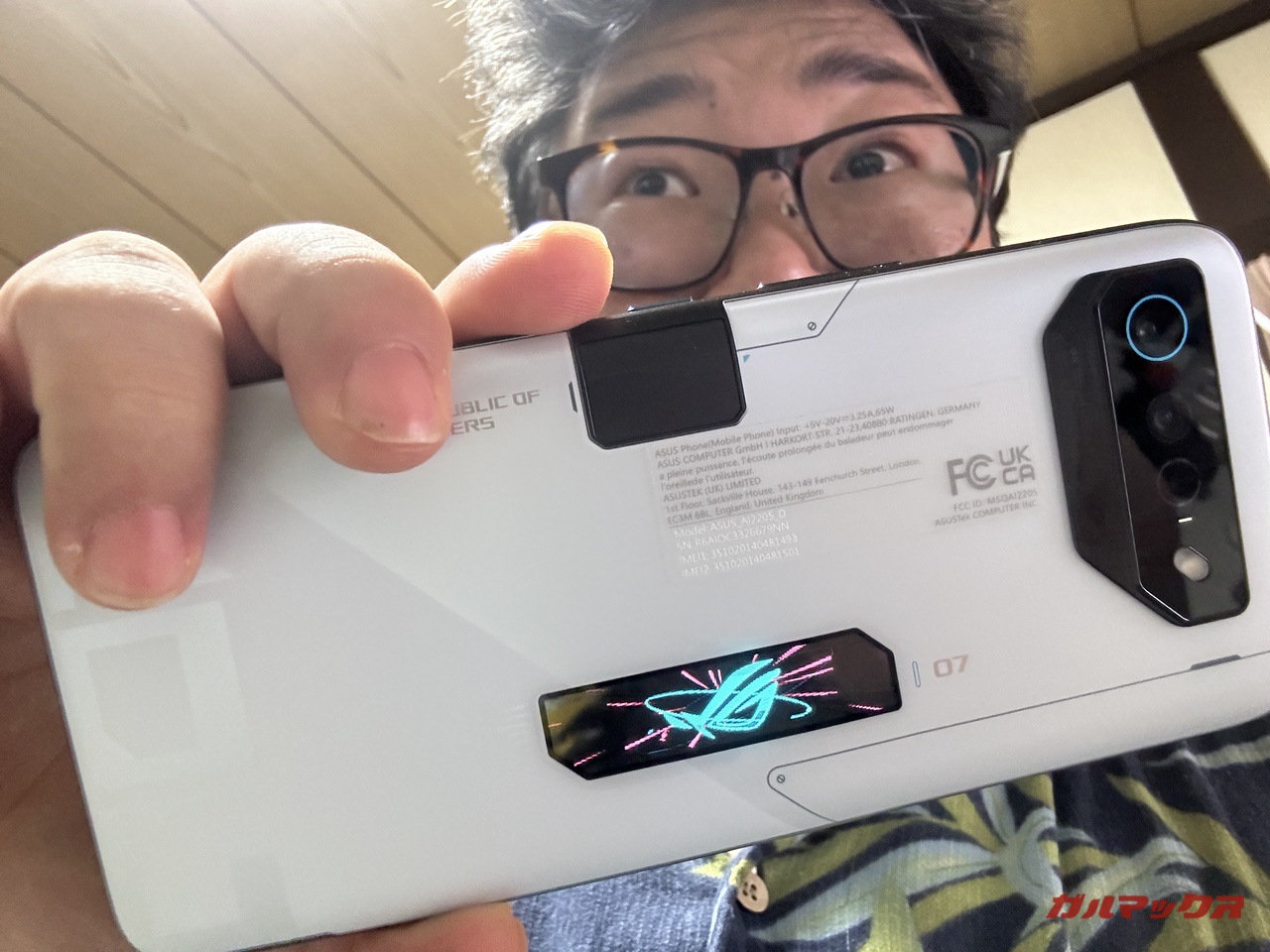 標準モデルのROG Phone 7は背面ディスプレイが無い代わりに、背面中央左のストレートに光っているライトとROGロゴがピカピカ光るようになってます!(色も変えられるとのこと!)