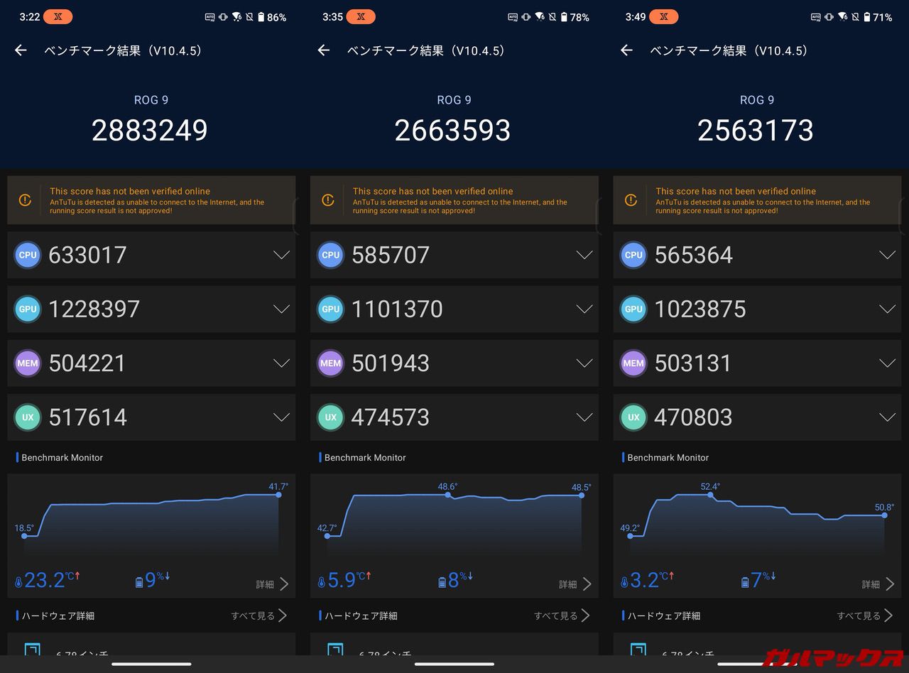 ▼AnTuTuスコアは290万点に迫る勢い。放熱性能が普通のスマホよりも高められているので長時間プレイしても性能が落ちづらくなってます。↓