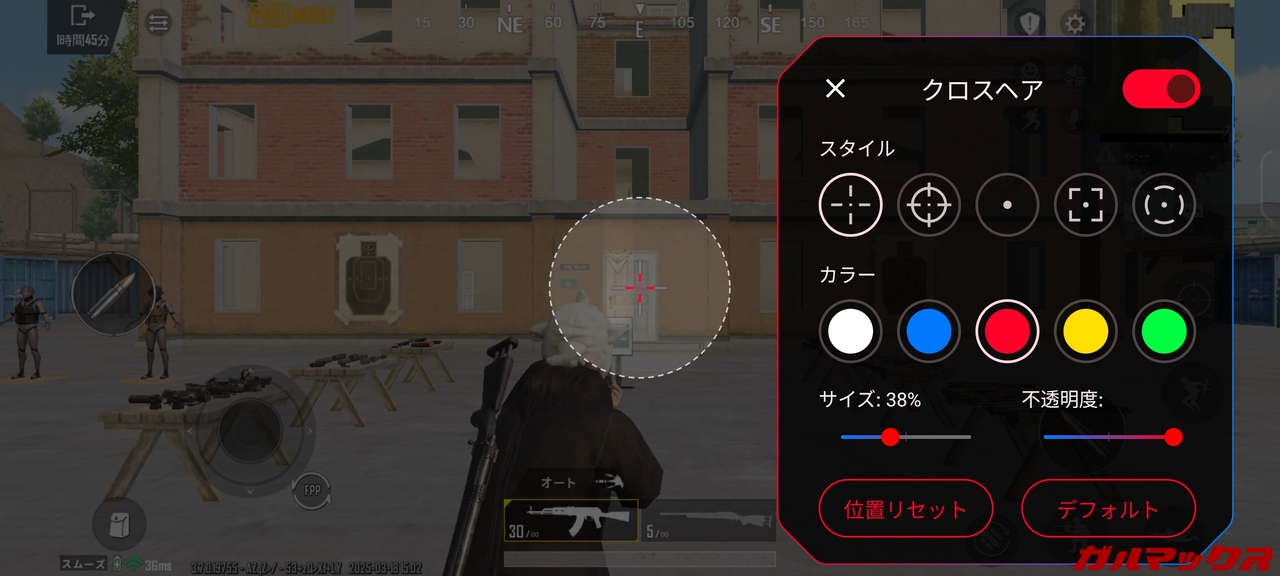 レティクルのデザインやカラーが選べるだけでなく、サイズや不透明度も設定できるので、めっちゃ実用的。