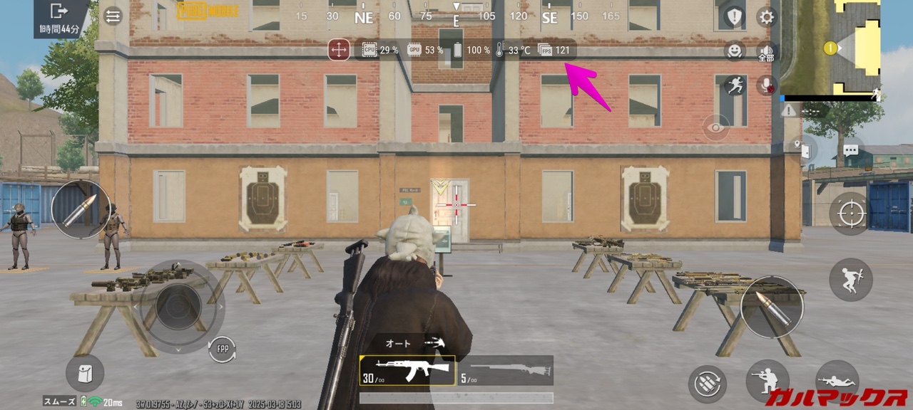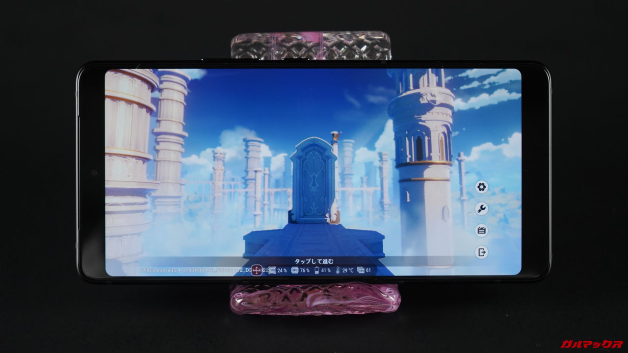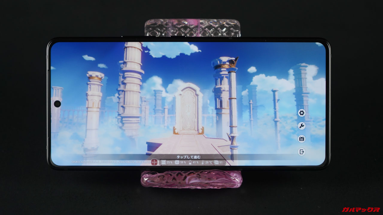 スタンダードなスマホでもゲームモード画面ならフレームレートを確認できるモデルもありますが、ROG Phone 9はゲーム画面に重ねた状態で確認できますよ!グラフィック設定変更後のフレームレートの変化をチェックしやすくて良いですねぇ。