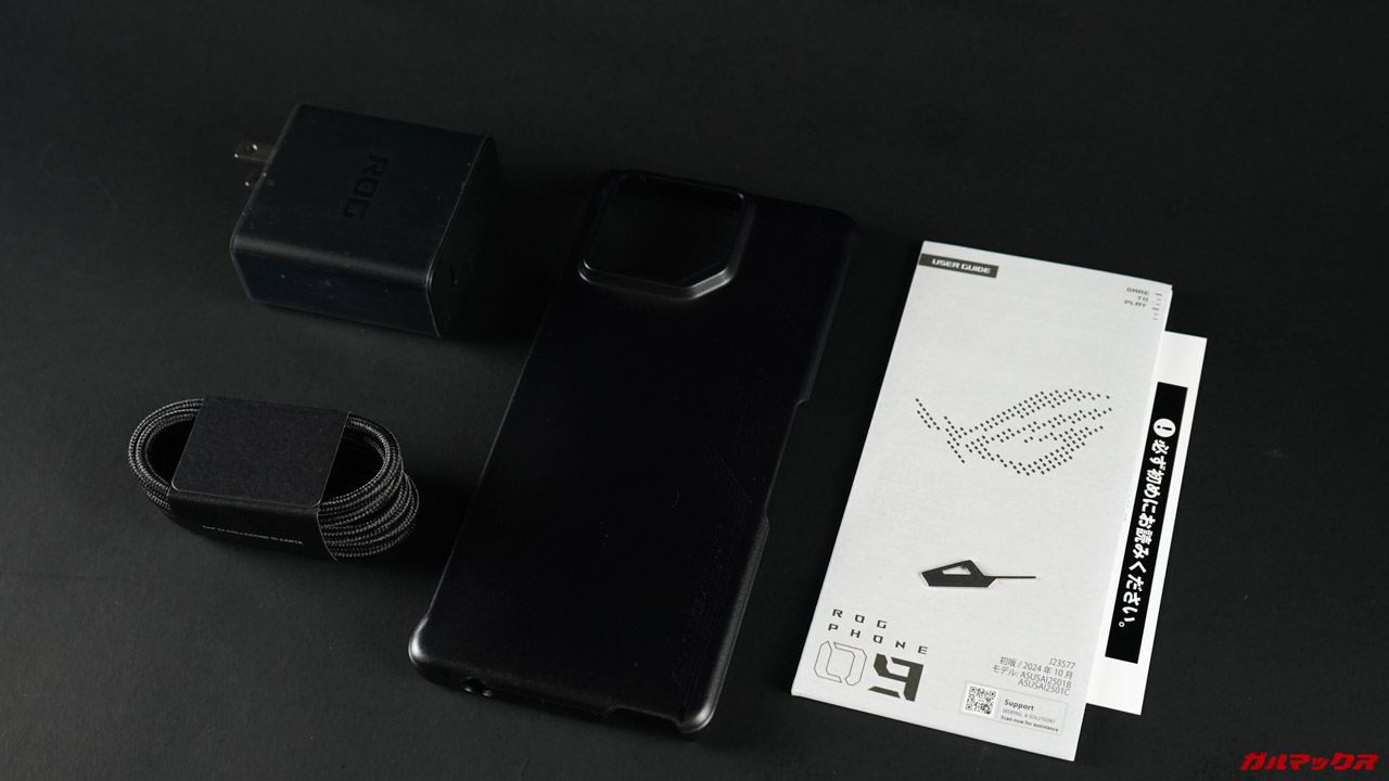 最近は付属品が寂しくなりつつあるスマホ業界ですが、ROG Phone 9は急速充電器やケースが付属するのが嬉しい!なお保護フィルムは貼られていなかったので別途購入しておくのが良いかも。