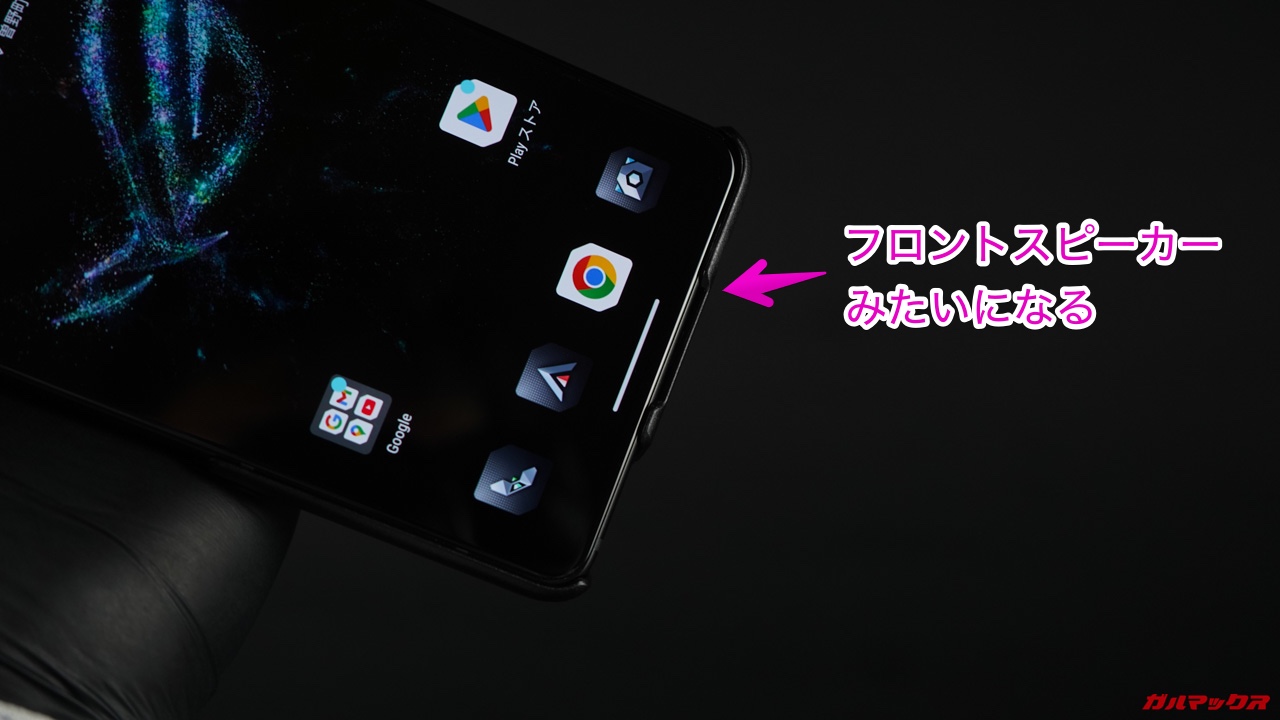 ▼ディスプレイは6.78型のパンチホールタイプを採用!ゲームがプレイしやすく日常使いもできる良い塩梅のサイズ感。ディスプレイ上部の受話口がスピーカーとなっています。↓