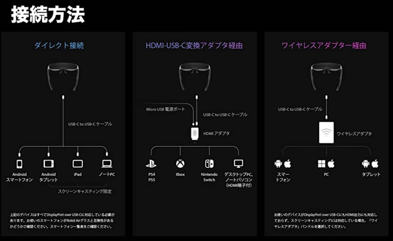 ▼前提として、Rokid Airはスマホやゲーム機といった機器から映像を出力できるモニターのような役割を為します。言い換えればモニターがグラサンになったようなもの。どこでも手軽にゲームや映像視聴を楽しめるぞ!↓