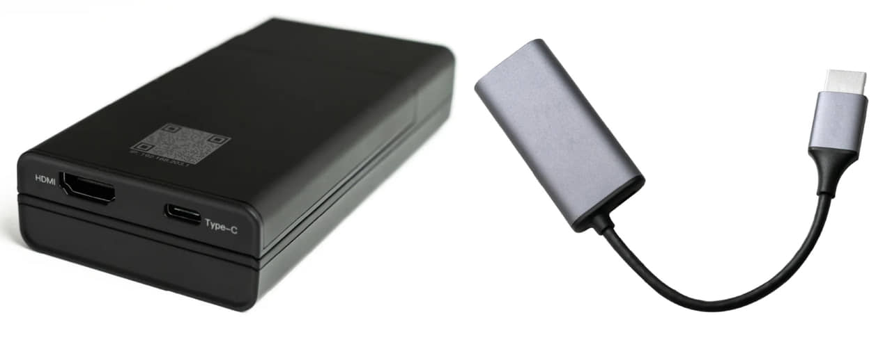 ▼また別売りのアクセサリーとしてワイヤレスで接続できる機器と、HDMI端子に変換して接続するアダプタも用意されています。ゲーム機の場合は右のアダプタが必須。↓