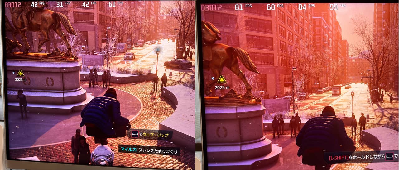 ▼左はDLSSオフ、右がDLSSオン+フレーム生成↓