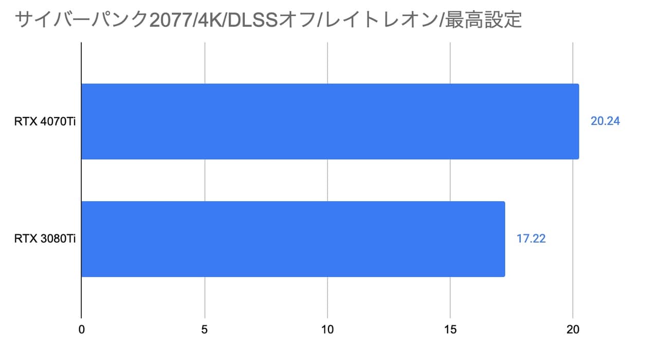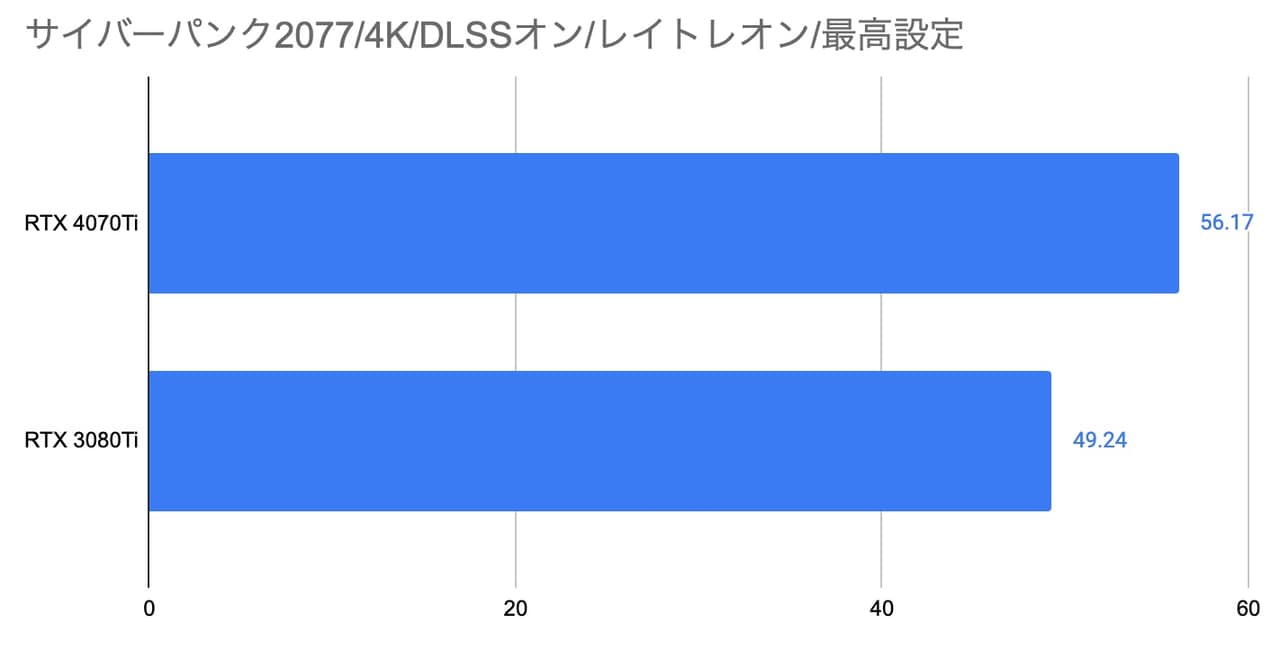つまり、現時点でのRTX 4070Tiは「伸びしろがある状態」ってことなんです。サイバーパンク2077がDLSS 3に対応したら追加検証してお伝えします!