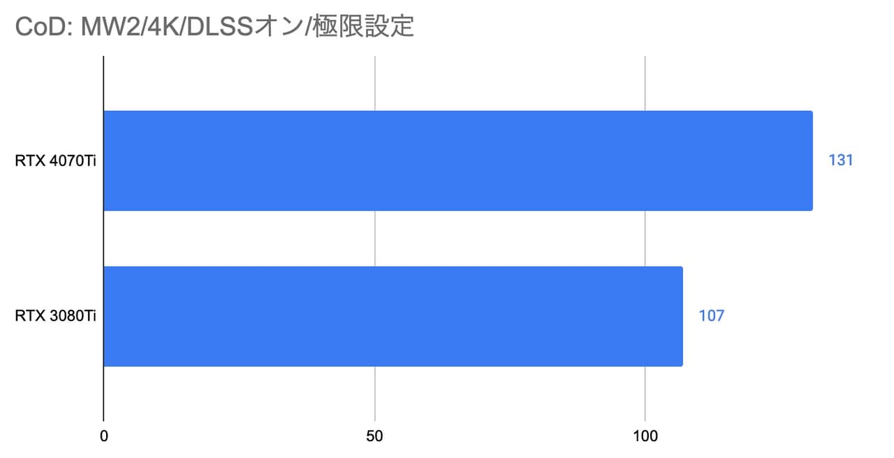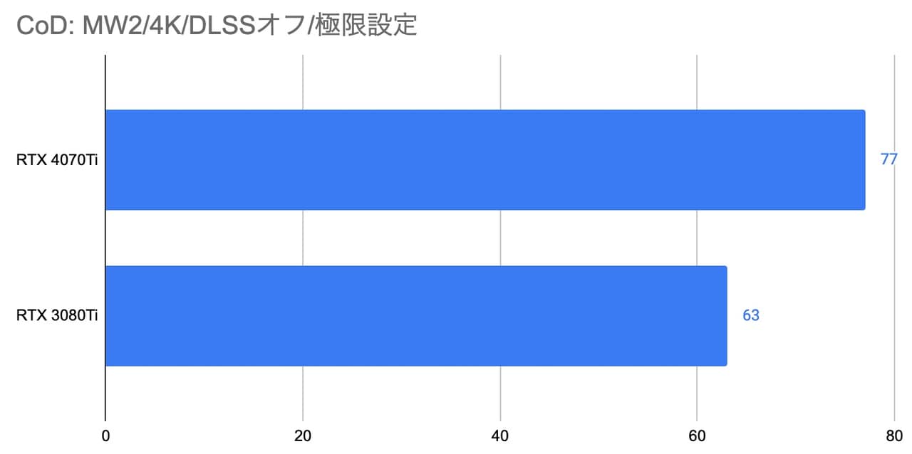 ちなみに最低フレームレートはRTX 3080Tiが71FPSに対しRTX 4070Tiが90FPSでした。RTX 4070TiだとCoD: MW2は今まで以上に4Kの高リフレッシュレートディスプレイの性能を活かせそうですね!
