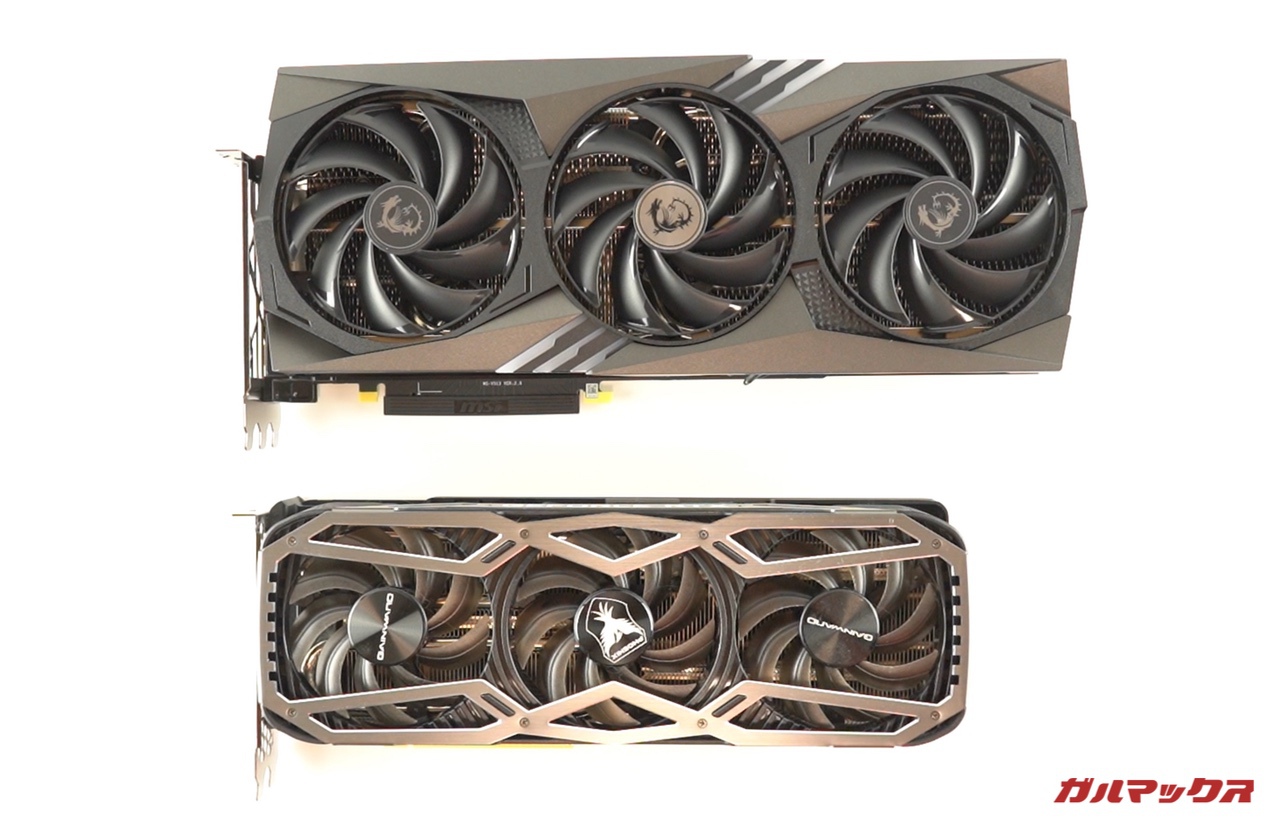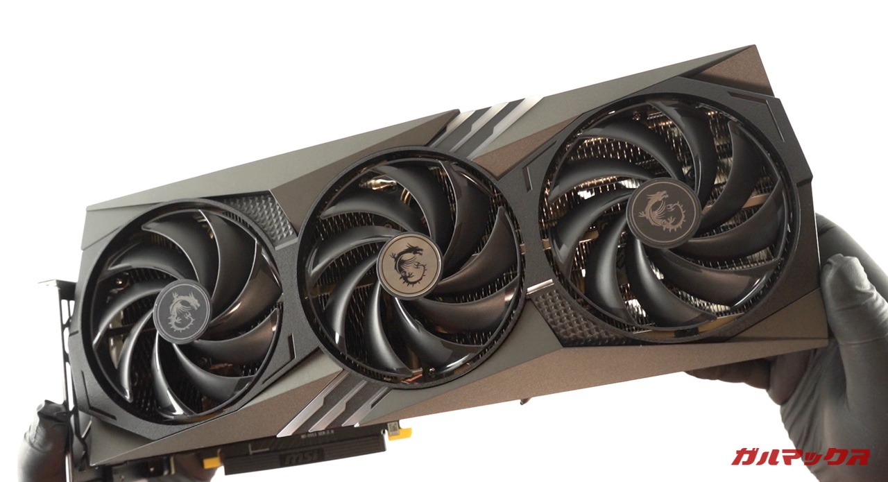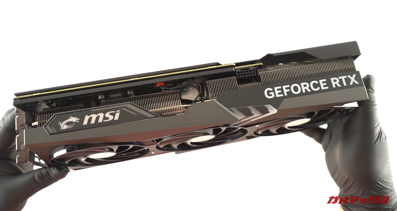 ▼MSIのRTX 4070 Ti GAMING X TRIO 12G/A VD8369の独自ファンが大きいってのもありますが、3スロット必要で横幅は約340mm。重量も約1.6Kgとヘビー級。RTX 3080Tiより大きさも重量も増してます。↓