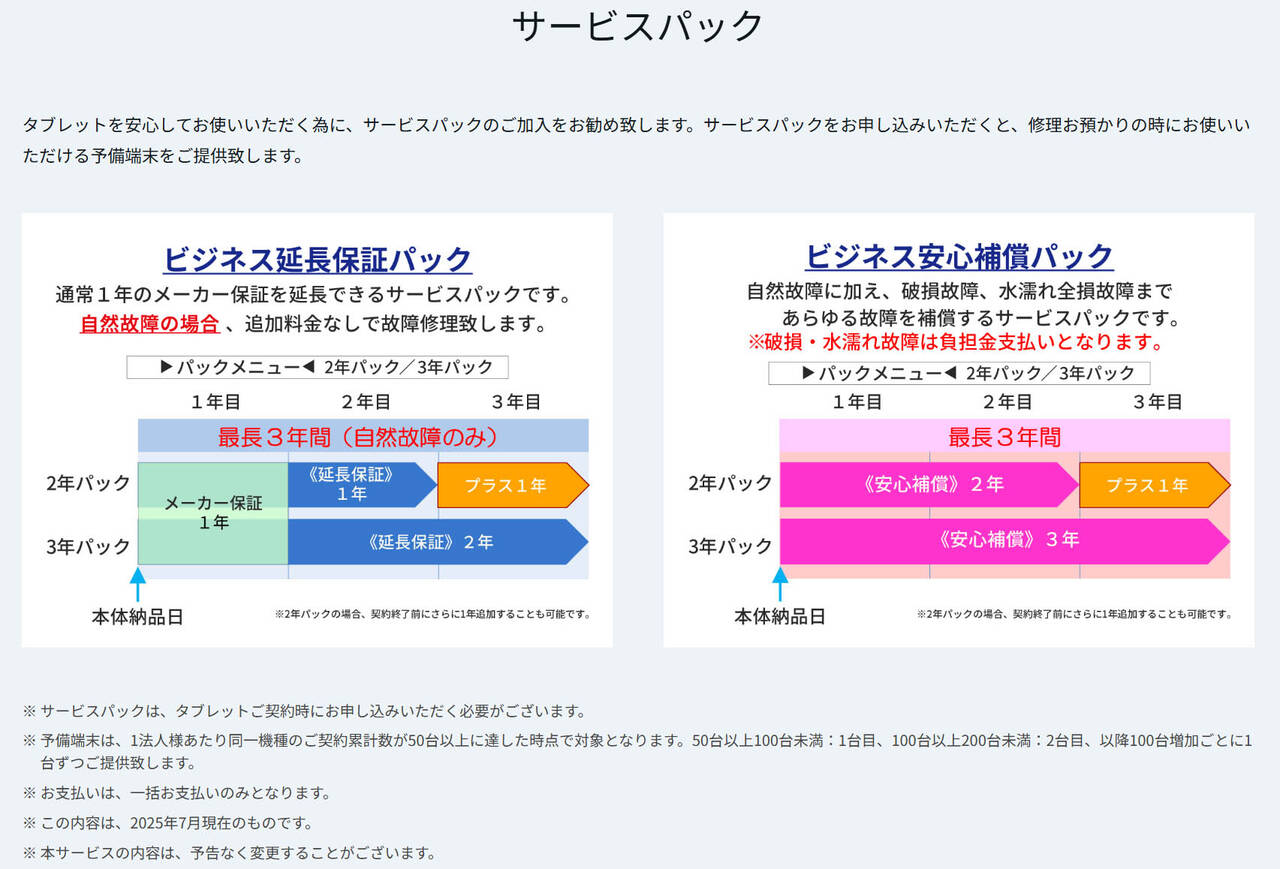 ▼法人向けのオプションも提供されています。メーカー保証の延長や、修理時の予備端末の提供などが可能とのこと。↓