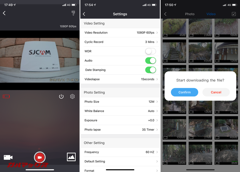 遠隔で画角チェックや録画開始/停止ができるほか、SJ8 PLUSに保存されている映像のチェックなども可能となっています!が、ストリーミング再生は出来ずデータを一旦スマホにダウンロードしてからチェック可能となってました。この当たりは改善してほしいポイントですね。