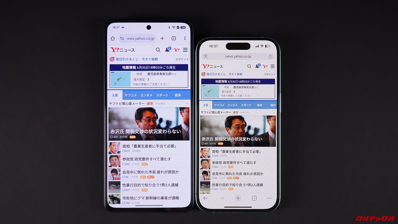 ▼ディスプレイサイズは6.7型の大画面なので動画も見やすい!(右のスマホはiPhone 16)。またスピーカーもステレオを採用しています。↓