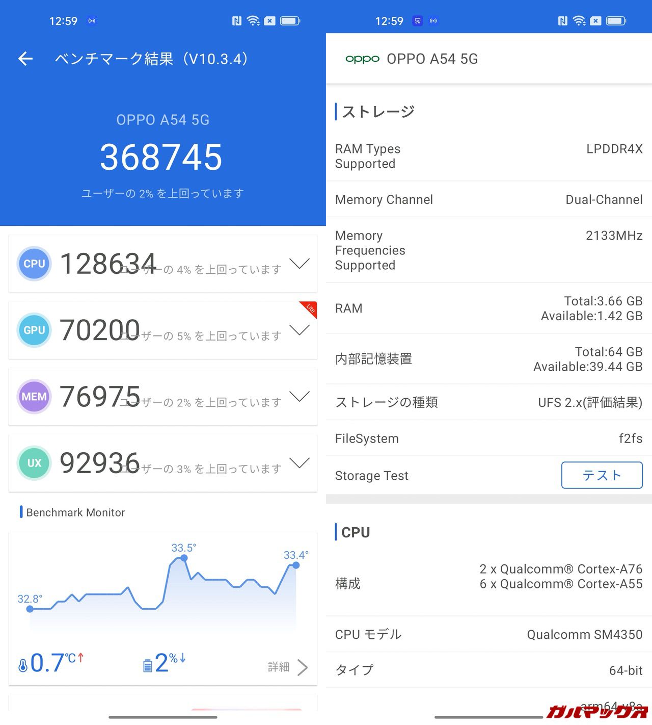 操作の快適性を表すUXスコアは10万点を超えると快適と言われていますが、Snapdragon 480はわずかに届かず。とは言えエントリー帯としては性能は高い部類で、一般的な使い方であれば大きな不満もなく使える水準です。