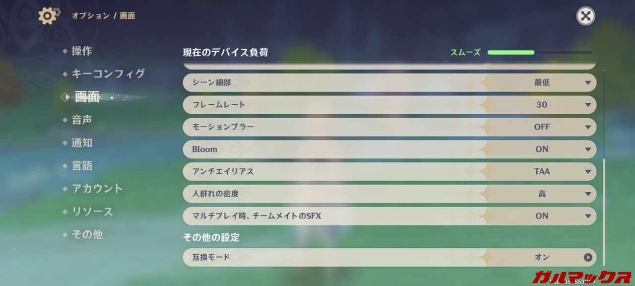検証では画質を「中」、フレームレートを60に設定してマップの3箇所をワープ後に4キャラ分の元素爆発を連続発動した際の高負荷状態で下限フレームレートを測定しmす。