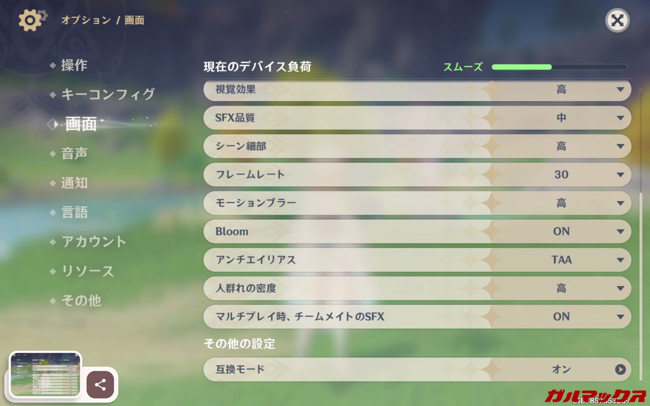 検証では画質を「中」、フレームレートを60に設定してマップの3箇所をワープ後に4キャラ分の元素爆発を連続発動した際の高負荷状態で下限フレームレートを測定します。