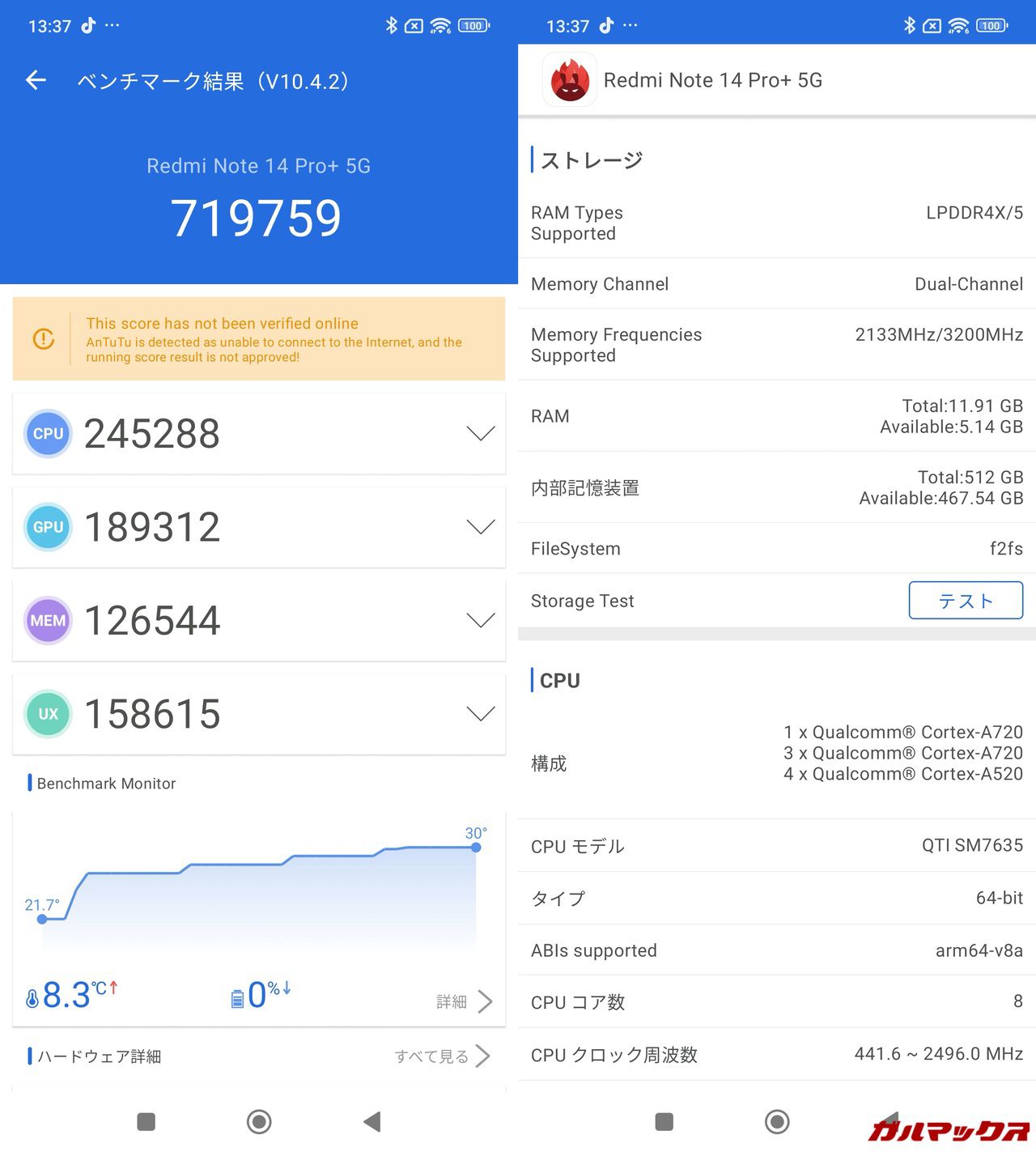 ▼Snapdragon 7s Gen 3の実機AnTuTuのスコアは総合スコアが719,759点、GPUスコアは189,312点、UXは158,615点となっていました。↓