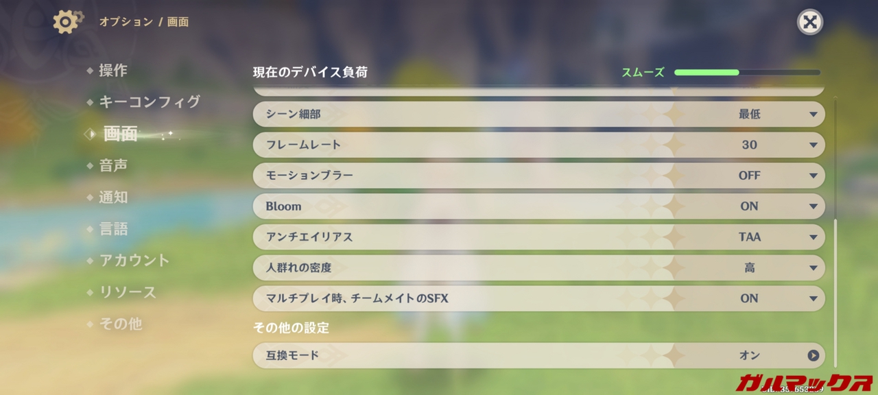 検証では画質を「中」、フレームレートを60に設定してマップの3箇所をワープ後に4キャラ分の元素爆発を連続発動した際の高負荷状態で下限フレームレートを測定します。