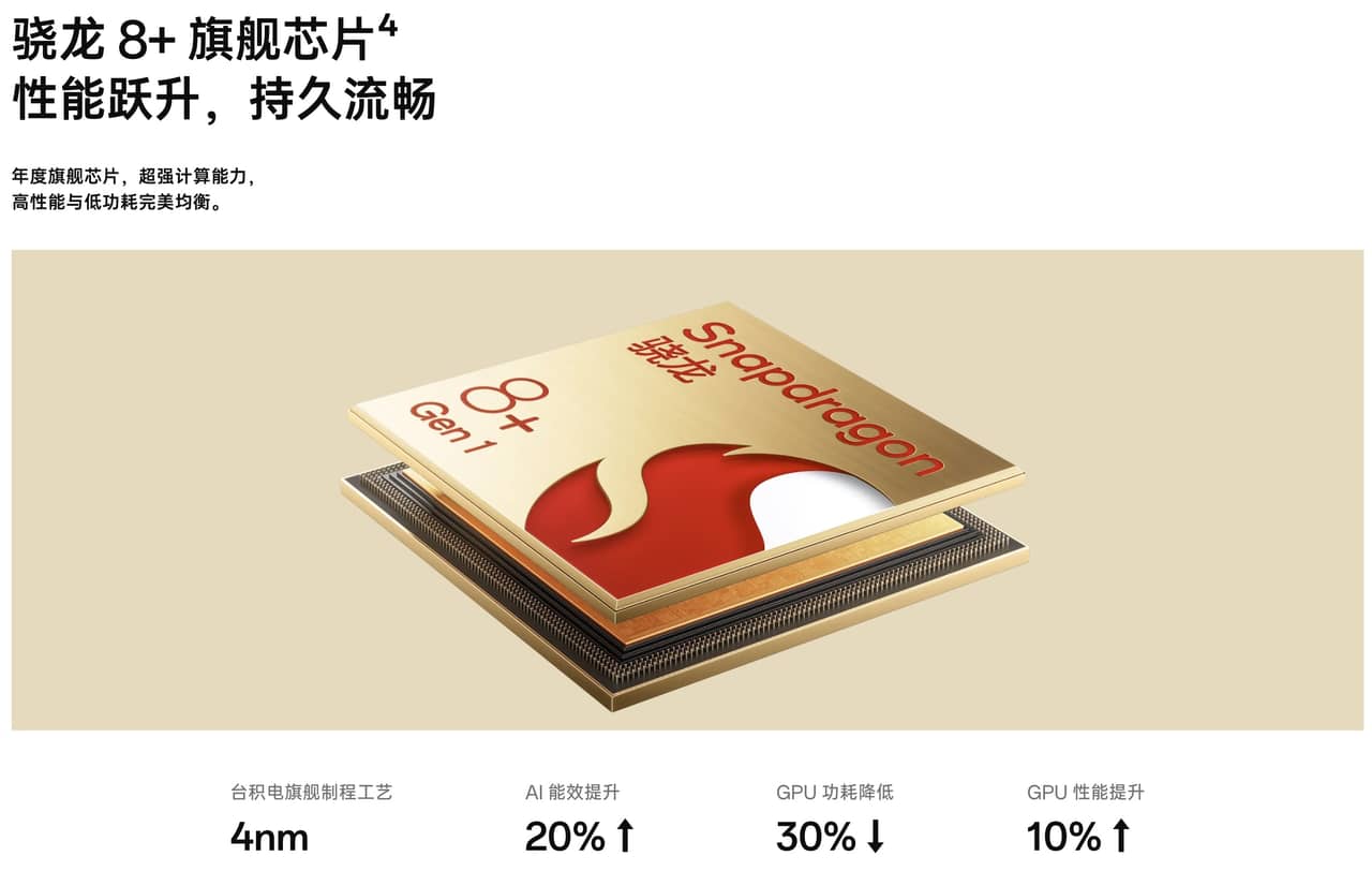 4. 第一代骁龙 8+ 移动平台有不同 CPU 主频的版本,OPPO Reno9 Pro+ 搭载 CPU 最高主频为 3.0GHz 的版本。数据来自于高通官方数据,实际使用效果可能因环境与个人使用习惯存在差异,请一切以实际体验为准。