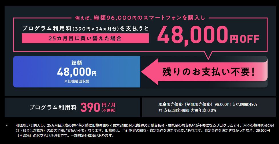 ソフトバンク回線契約者以外でも利用が可能で、端末を48回払いで購入し、25ヶ月目以降の買い換え時にその端末を返却することと引き換えに、最大24回分の支払い金が免除されます。