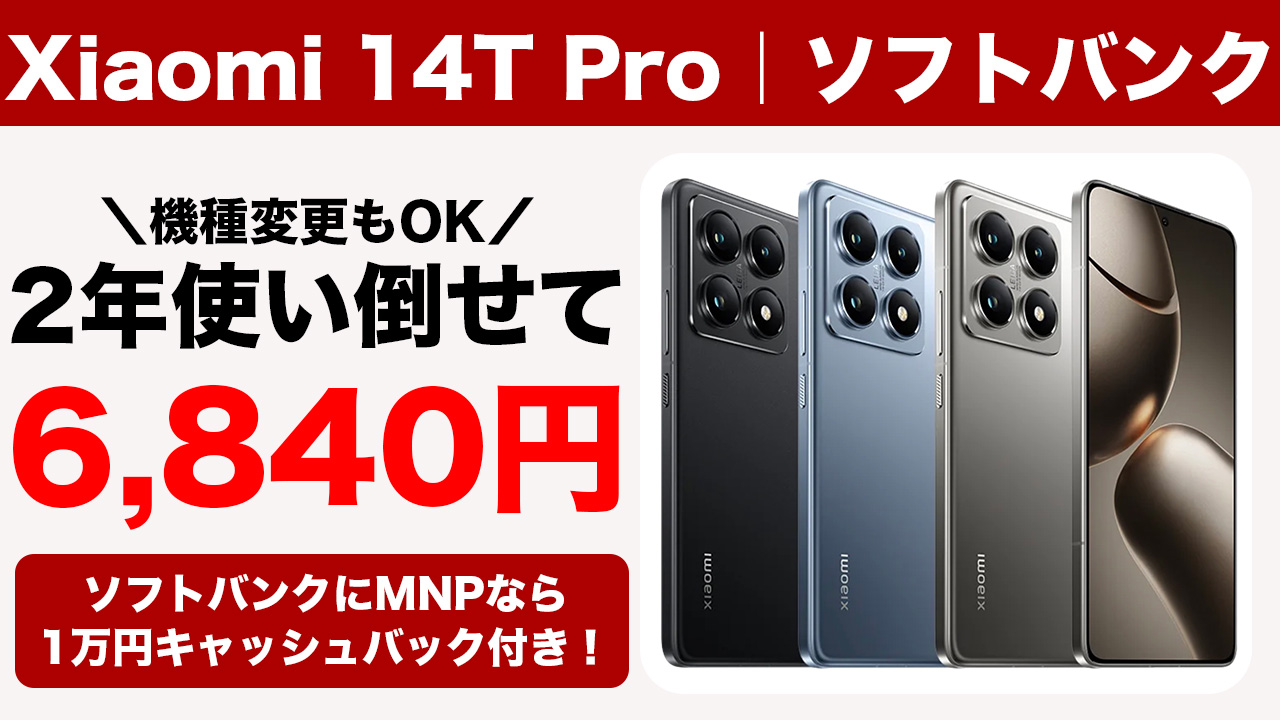 ソフトバンクXiaomi 14T Proが大幅値下げ。2年レンタル6,840円、機種変更でもOK!MNPはキャッシュバックも