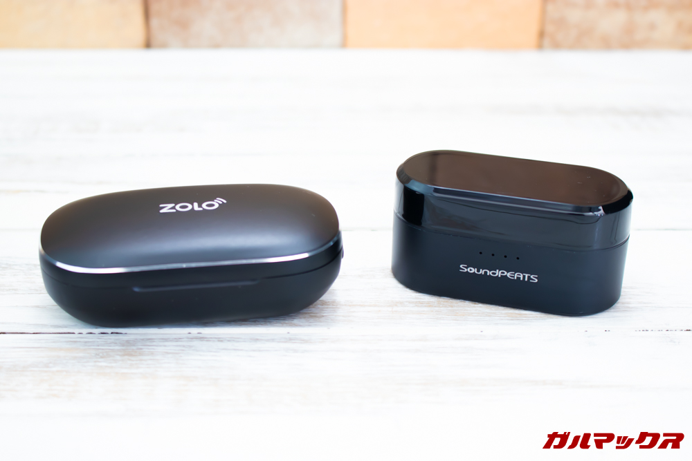 ▼充電ケースのサイズ感はこんな感じ。手元に「Zolo Liberty+の実機レビュー。音質・付け心地・電池持ちの総まとめ」で紹介したイヤホンがあったので比較。サイズ的には縦に長く奥行きは薄い感じ。↓