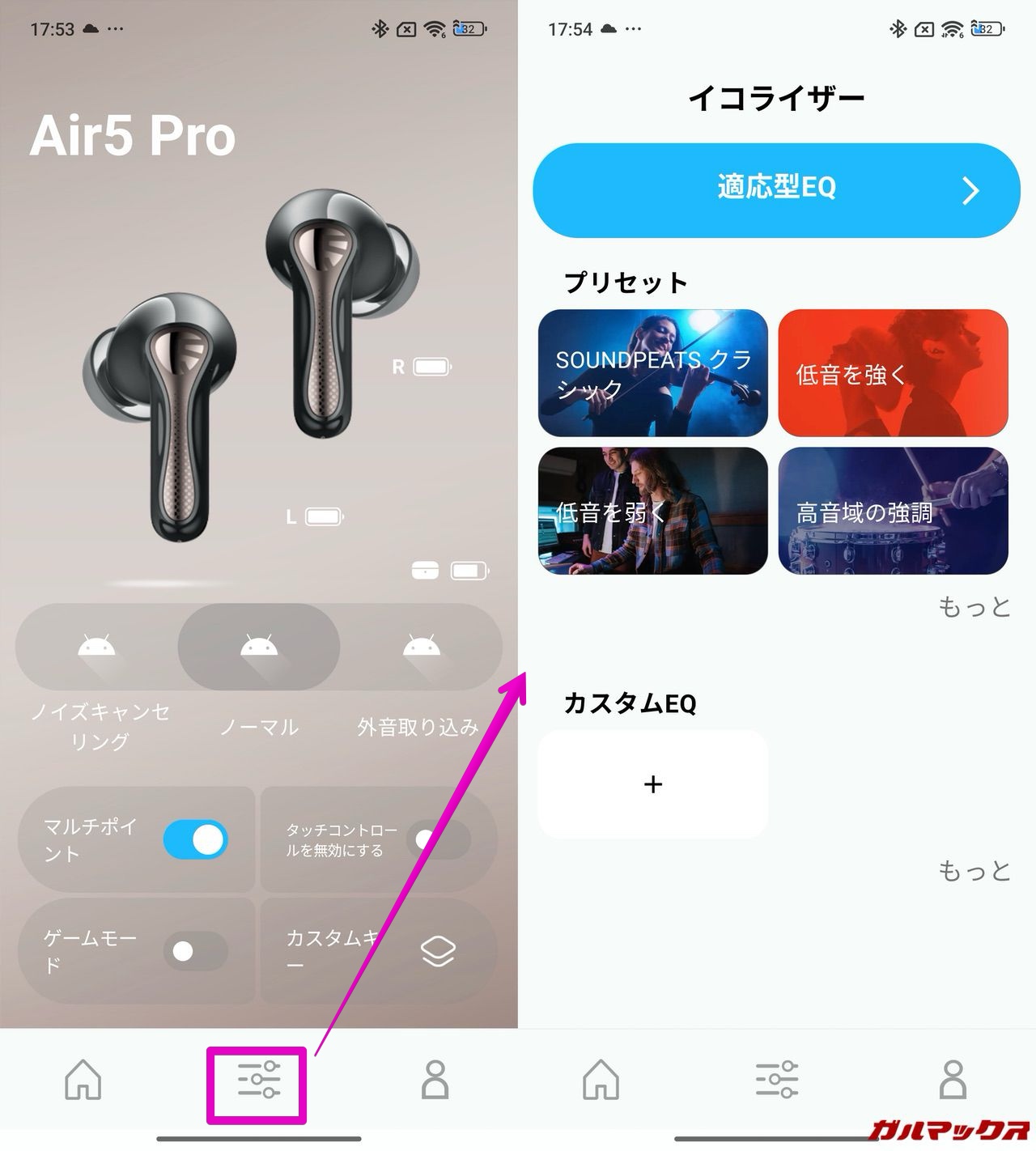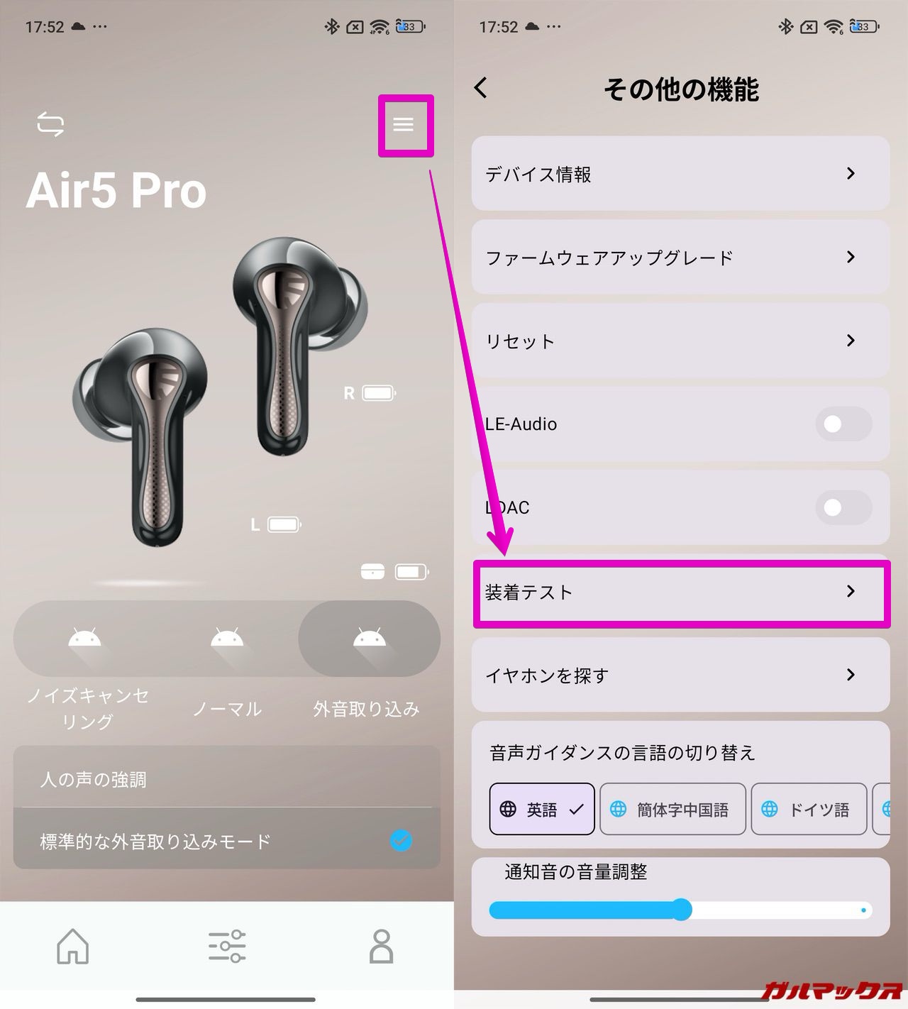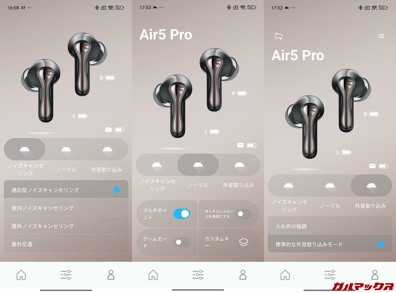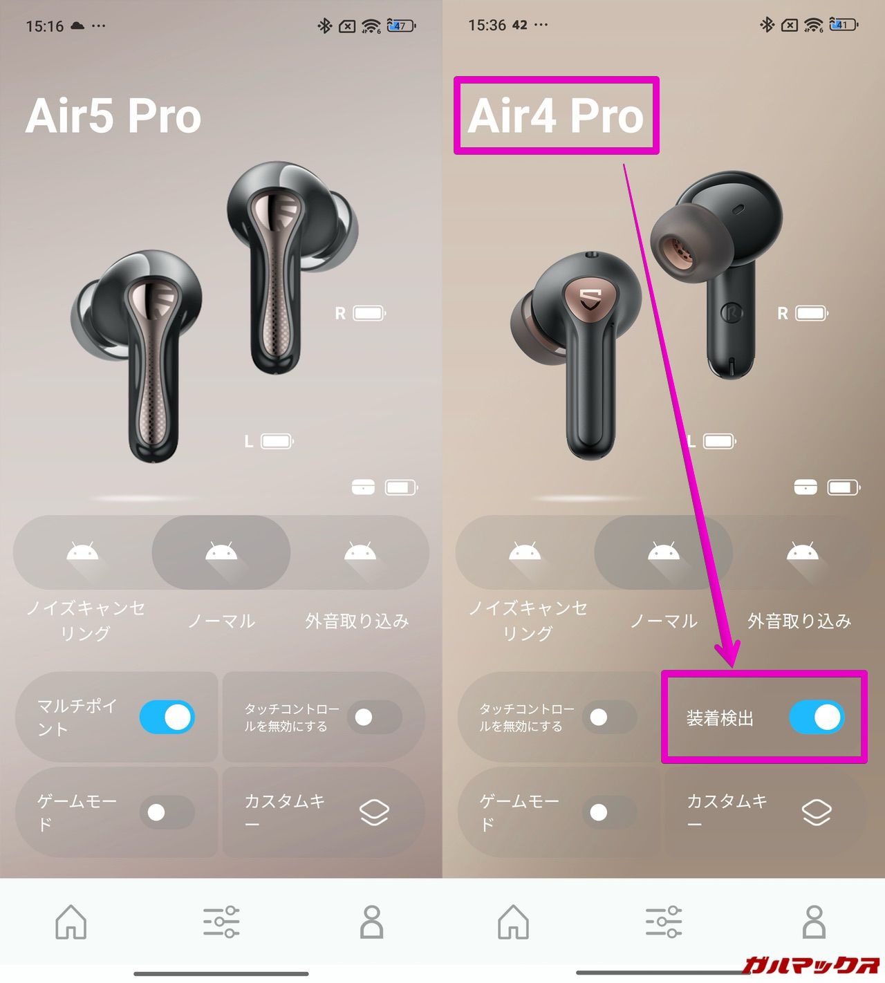 ▼Air4 ProとAir5 Proのアプリを見比べていて気がついたんですが、Air5 Proは「装着検出」が省かれてました。↓