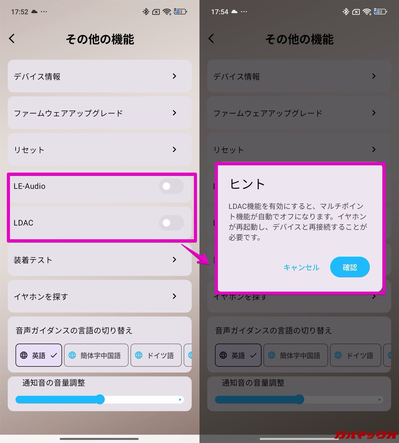 マルチポイント機能との併用は出来ないんですが、これらをオンにすることで確実に狙ったコーデックで接続できる(例えばLDACで繋ぎたいのにapt‐X Losslessで繋がるパターンを防げる)ので、隔離されたオン・オフ機能はLE‐AudioやLDACで接続したい人には嬉しい機能と言えそう!