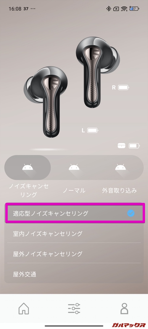 ▼ノイキャン効果は室内ノイズ、屋外ノイズなど複数用意されてるんですが、自動で調整してくれる適応型を選んでおけばOK。↓