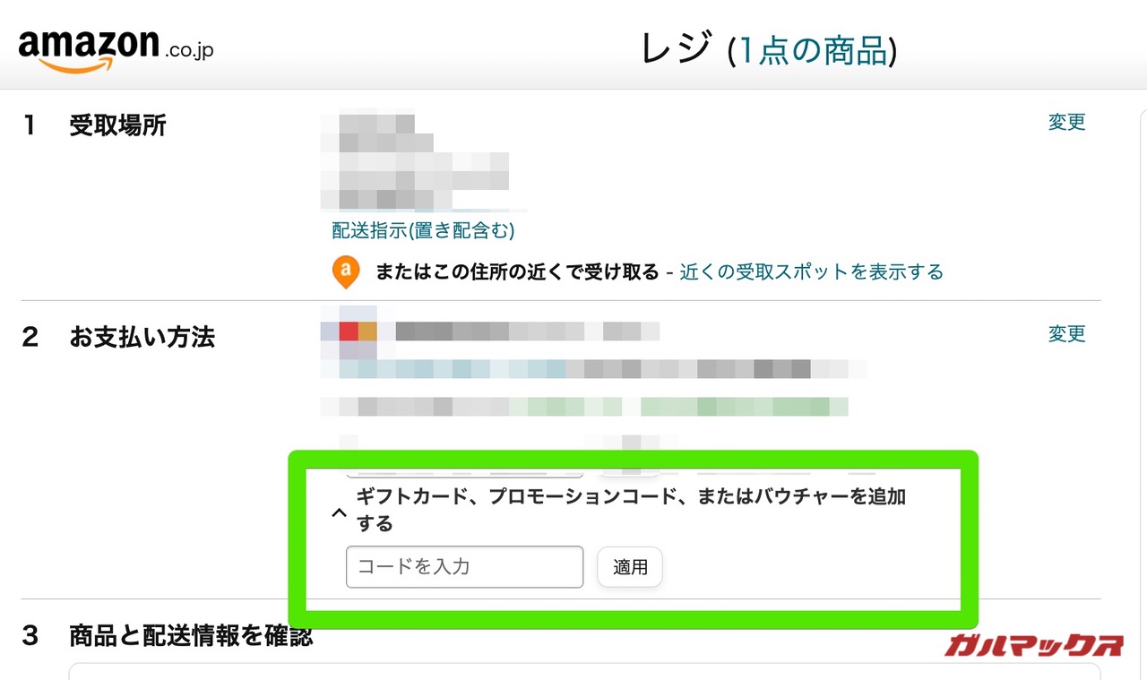 ▼②レジ画面で「ギフトカード、プロモーションコード、またはバウチャーを追加する」でガルマックスのクーポンコードを入力して適用する。↓
