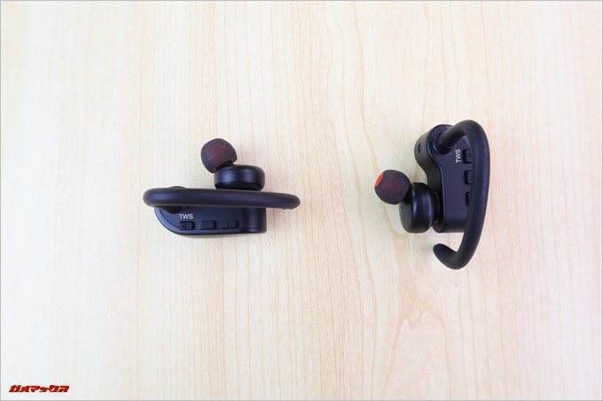 ▼左右完全ワイヤレス。ケーブルなんて一本も無いです。本体にはイヤーフックが備わっているので耳にガッチリ引っ掛ける事が可能です。本体の上部には3つのボタンが並んでおり、小さいながらも操作感は高いです。↓