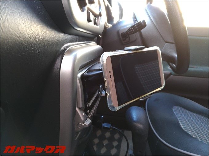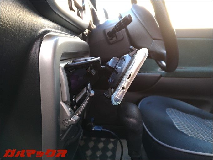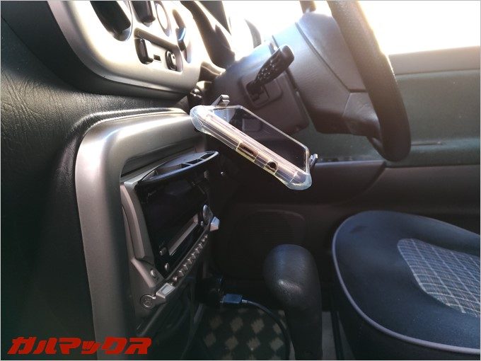 5.5インチ(カバー付き)のスマホをSpigenのホルダーへ。ボールジョイントで角度の自由度が高く下部CDスロットでも問題なし。