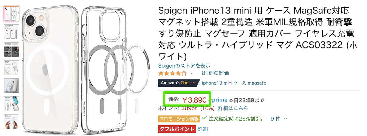 ▼iPhone 13 miniのMagSafeアクセが使えるケースを買っとこうとレジに入れたんだけど…35%オフになってるぞ。やらかしたかSpigen。↓