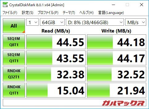 ▼これは32GBの読み書き速度テスト後に速攻64GBの追加テストを行った時のデータです。メーカー目安は430MB/sとしてますが著しくデータ転送速度が落ちてますね。100GBクラスの書き込みだと使い物にならんのが分かるかと思います。↓