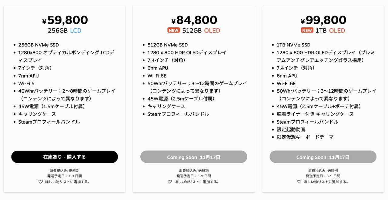 ▼通常のSteam Deckは59,800円で、今回発表されたSteam Deck OLEDは512GB版が84,800円、1TB版が99,800円となっています。↓