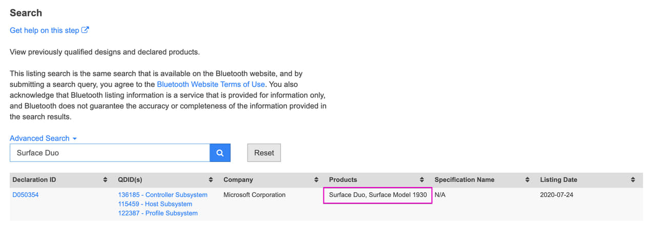 ▼Surface Duoの型番はBluetooth SIGで確認できました。↓