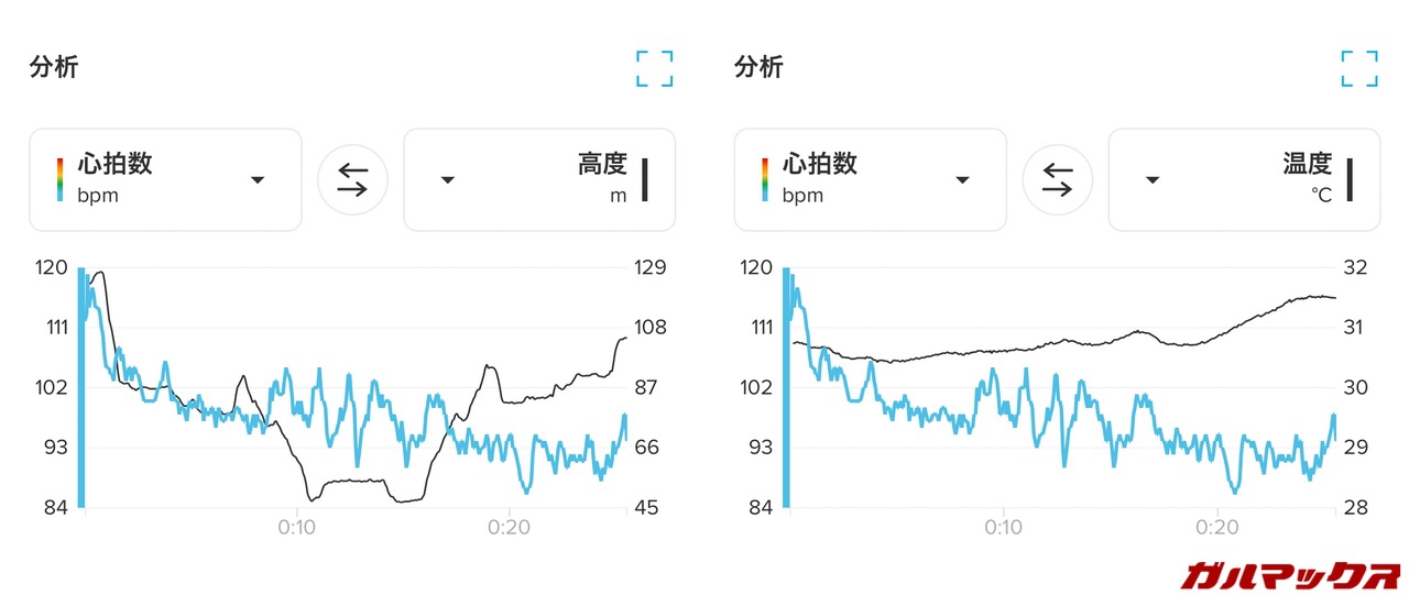 分析の項目では心拍数、高度、ペース、速度、温度の中から2種選んで変化をチェックできます。