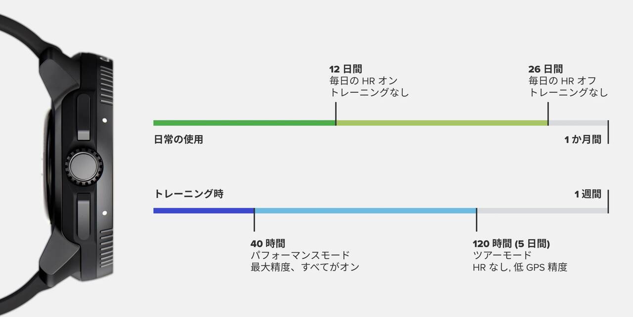 色んなセンサーをオンにしていますが、今のペースだと20日くらい持ちそうです。最大26日の電池持ちではありますが、バッテリーは使い方次第な部分が大きいので、日常的にトレーニングを行っているひとは上の画像の下側の棒グラフくらいになりそう。