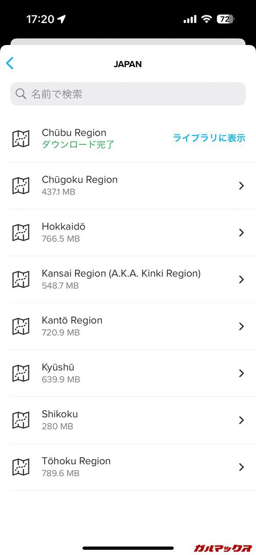 ▼オフラインマップはエリア分けされています。僕がダウンロードした中部のマップは約1.05GBで日本全体だと5.23GB。↓