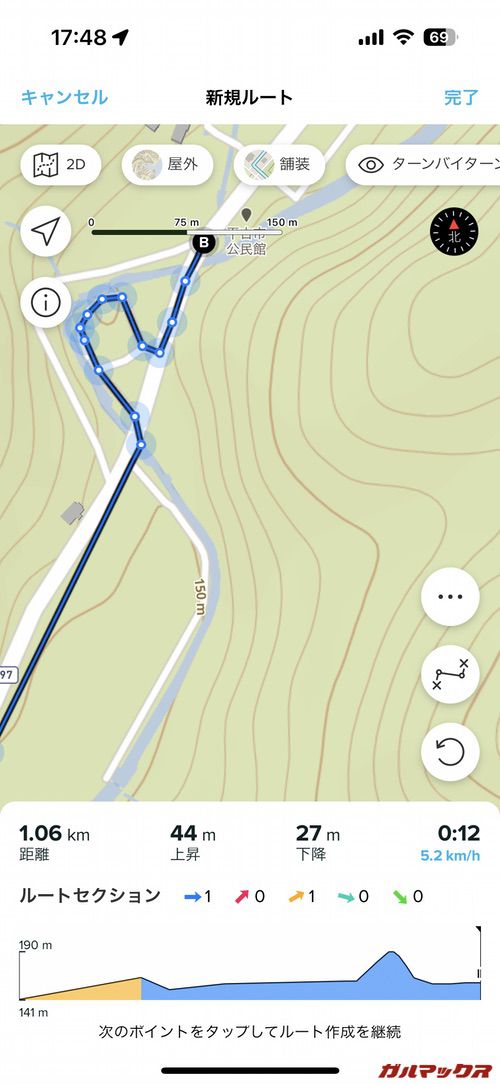 マップを見ながら細かくルートを選択する必要はありますが、瞬時に高低差や距離が計算され表示されるので負荷状況を考えながらルートを考えることが出来るようになっていますよ!